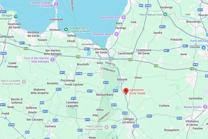 Agriturismo Corte Tonolli liegt im Hinterland südlich des Gardasees nahe → Peschiera del Garda. Im Vergleich zu klassischen Agriturismi ist die Anlage moderner aufgebaut und kombiniert ruhige Lage mit guter Anbindung an mehrere Orte.