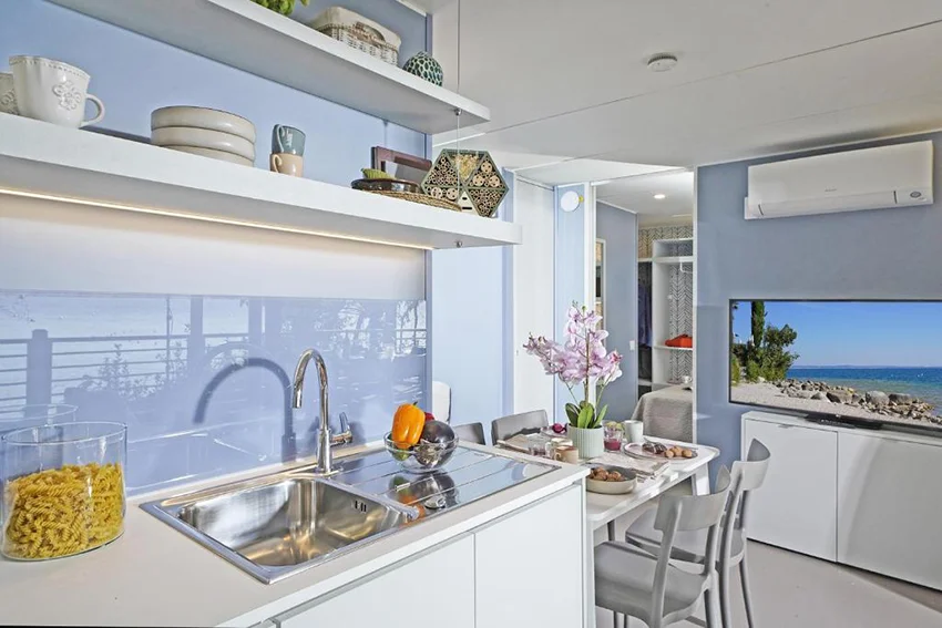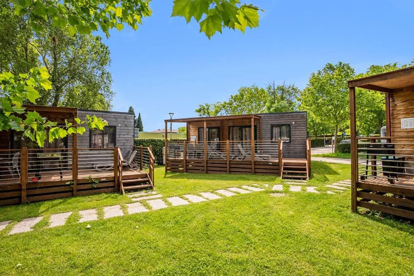 Neben klassischen Stellplätzen gibt es Mobilheime und feste Unterkünfte. Der Platz ist damit auch ohne eigene Campingausrüstung nutzbar.