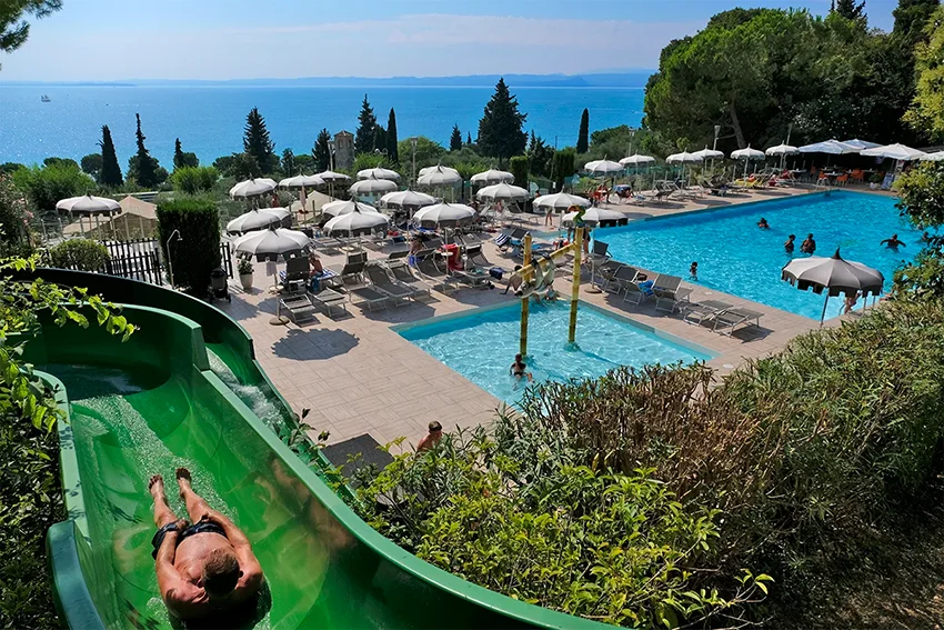 Campingplatz zwischen Garda und Bardolino – direkte Seelage, große Poollandschaft und viele Stellplätze.