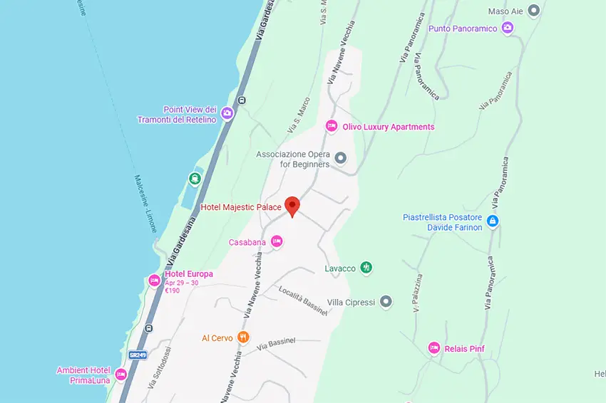 Das Majestic Palace liegt in Via Navene Vecchia 96 in Malcesine, oberhalb des Gardasees am Ostufer. Die Lage ist ruhiger als direkt im Zentrum, erfordert aber Wege zum See und in den Ort.
