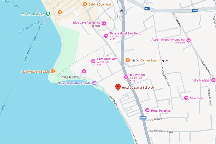 Das Hotel Du Lac et Bellevue liegt in Località Santa Cristina 8 in Bardolino, direkt am Ostufer des Gardasees.